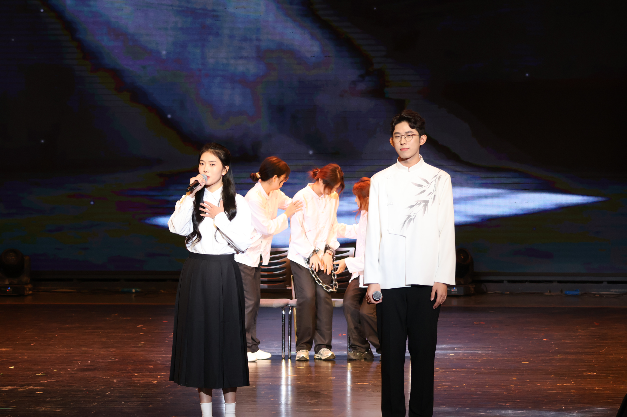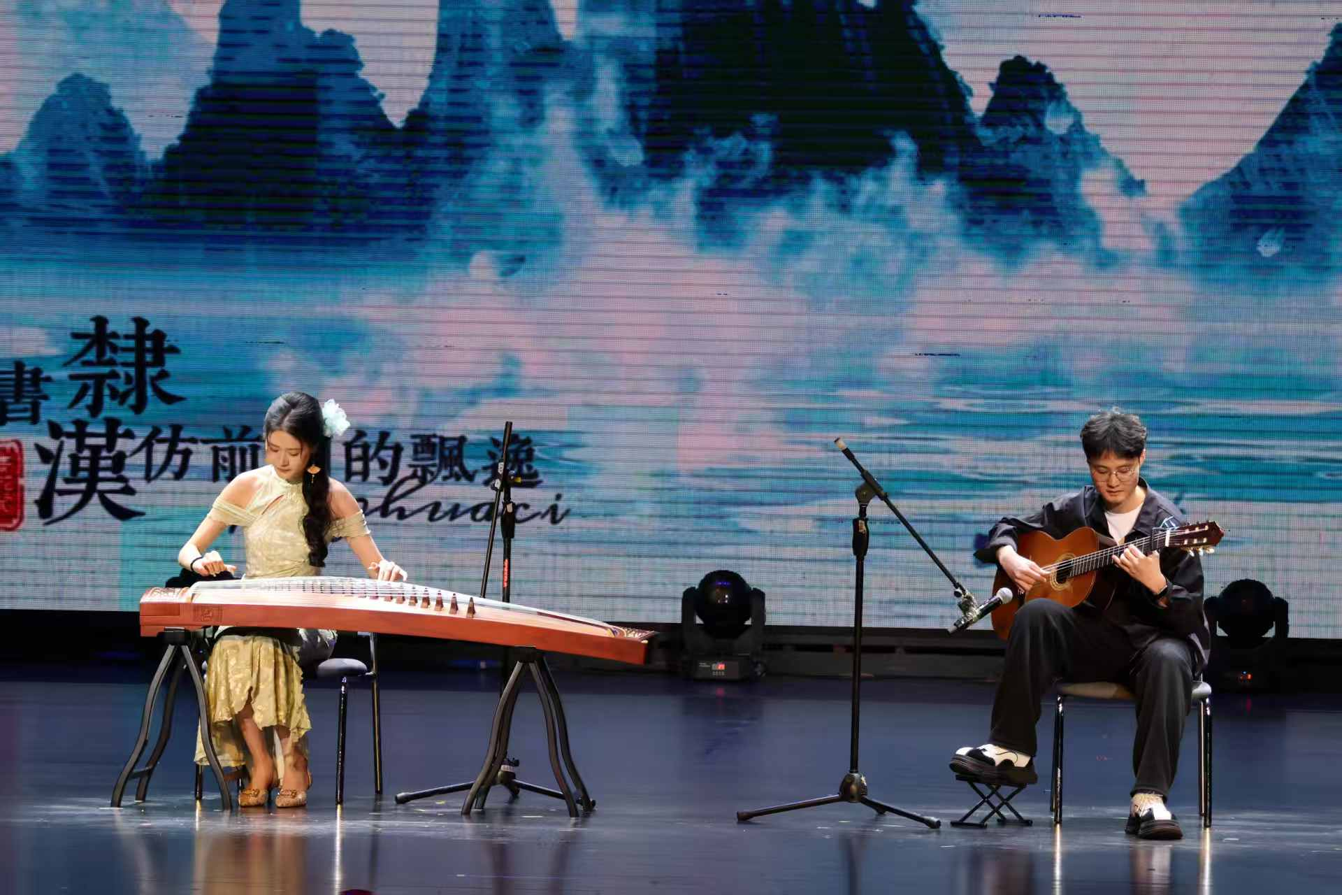 接下来,歌舞情景剧《铭记》,以光影交织的舞台呈现,回溯峥嵘岁月,传递先烈信仰,让现场观众在沉浸式体验中感悟传承的力量;歌曲串烧《奔赴山海》,串联起七首经典曲目,用清澈歌声诠释青春理想与初心坚守;古筝吉他合奏《青花瓷》,将古典雅韵与现代旋律巧妙融合,中西乐器的对话勾勒出烟雨江南的诗意画卷。