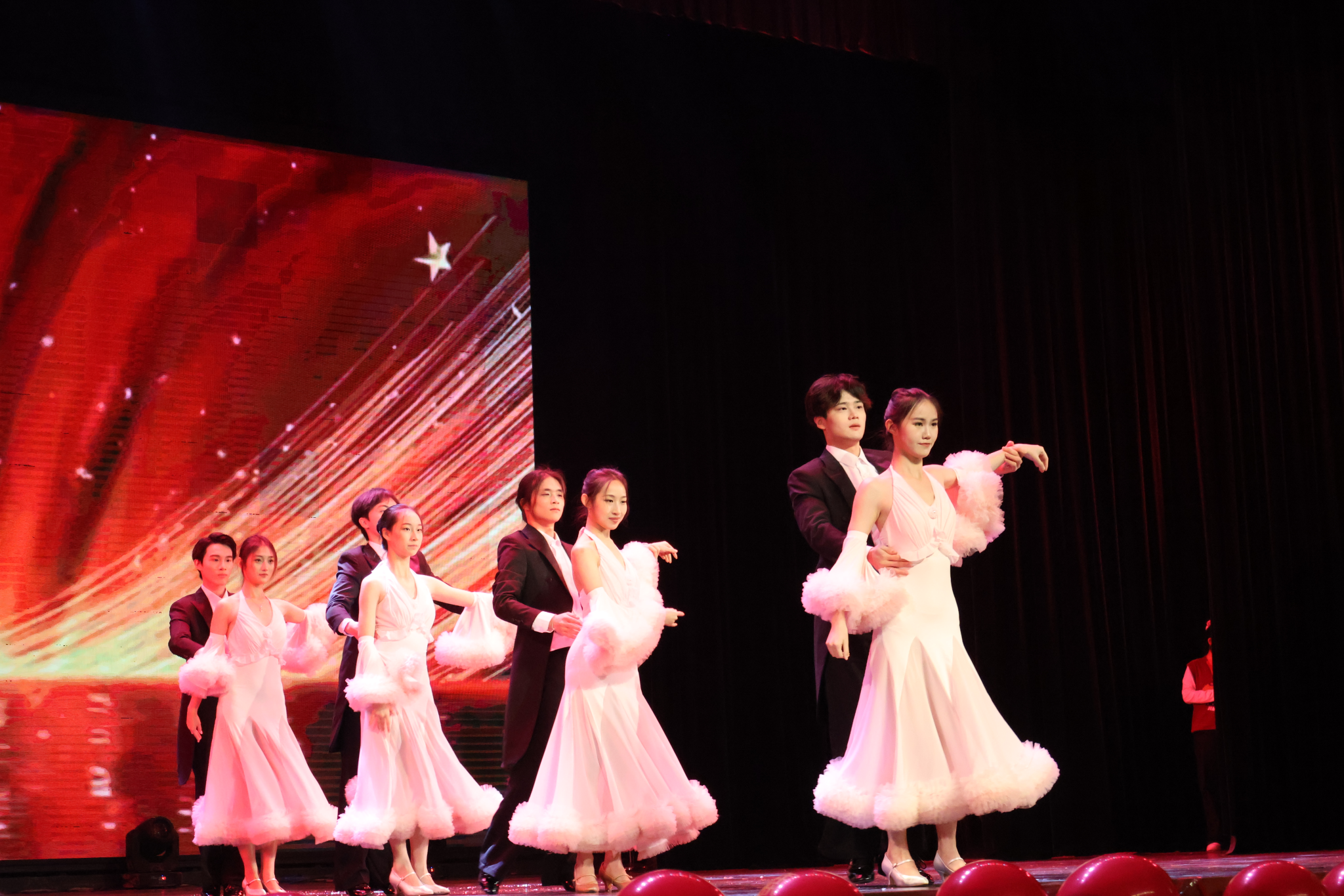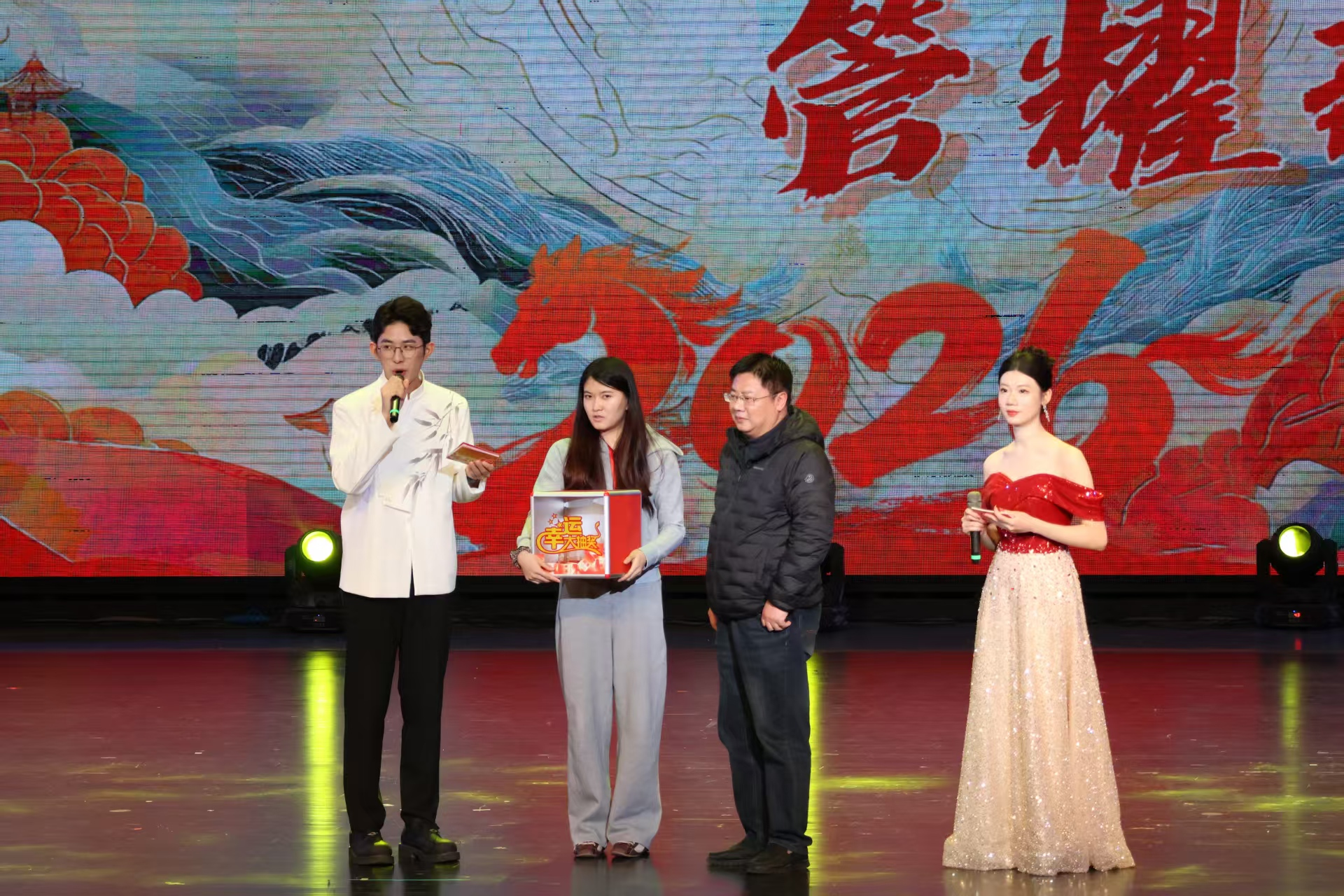 晚会期间设置的三轮抽奖环节一次次点燃全场热情,让欢声笑语持续升温。晚会尾声,学生国标舞协会带来舞蹈《我和我的祖国》,以昂扬姿态诠释家国情怀,晚会也在阵阵家国旋律中落下帷幕。