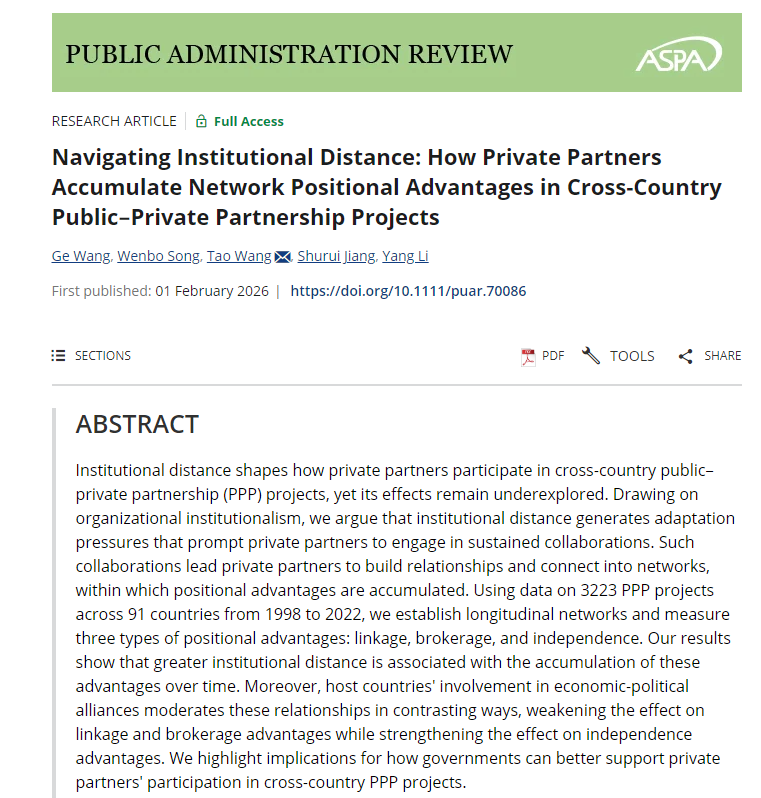 汪涛教授作为通讯作者、王歌副教授作为第一作者的研究成果“Navigating Institutional Distance: How Private Partners Accumulate Network Positional Advantages in Cross-Country Public–Private Partnership Projects”在公共管理学科顶级期刊Public Administration Review(PAR)在线发表。PAR由美国公共行政学会主办,创刊于1940年,以双月刊形式出版,在公共管理国际期刊中排名第一,是ABS 4*期刊。该文章由王歌副教授、博士研究生宋文勃、汪涛教授以及同济大学经济与管理澳门威尼斯人