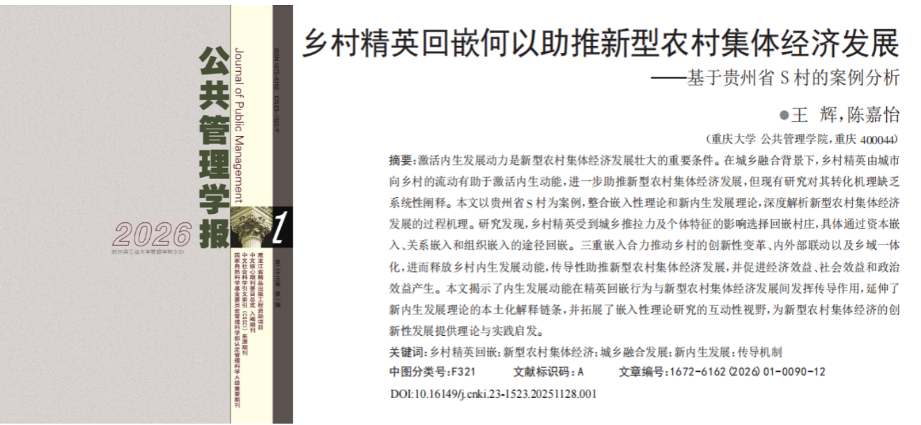 王辉教授作为第一作者的研究成果《乡村精英回嵌何以助推新型农村集体经济发展——基于贵州省 S 村的案例分析》在公共管理高水平中文期刊《公共管理学报》(2026年第1期)上发表。《公共管理学报》由哈尔滨工业大学管理澳门威尼斯人